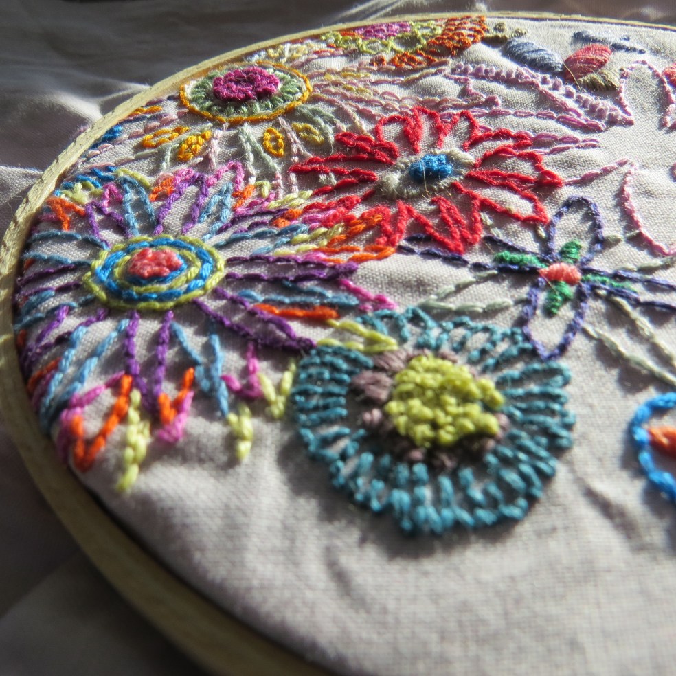 Embroidery first entered my life through a sampler of a kitten in a dress given to me by my grandmother. Over the past couple of years, with the help of a few books and fantastic people, I’ve started to feel more comfortable with floss & needle. This Alison Glass sampler caught my eye while browsing Super Buzzy & I started it as soon as possible.