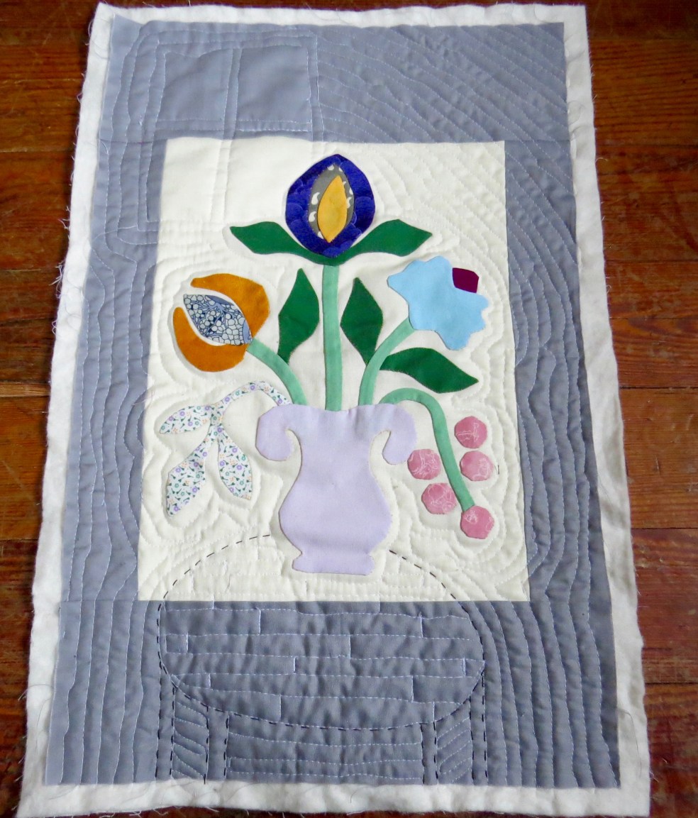 Yesterday held firsts. The Janome serger and sewing machine arrived! I’ve been waiting all month and it flew by. After returning home safely, I wasted no time switching over needle plate, threading up, and trying out free-motion quilting; Lori Smith’s appliqued piece was my first choice.